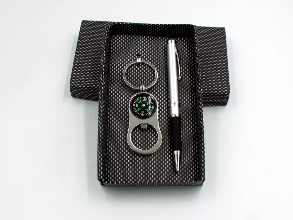 JGO PLUMA Y LLAVERO DESTAPADOR CON BRUJULA EN ESTUCHE